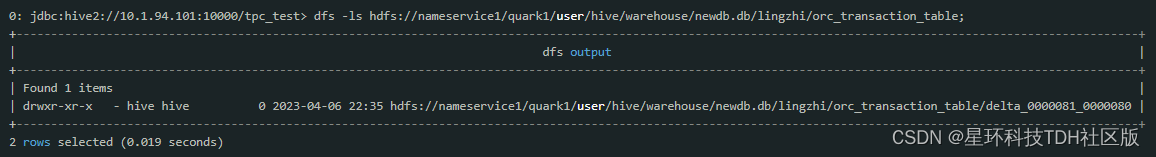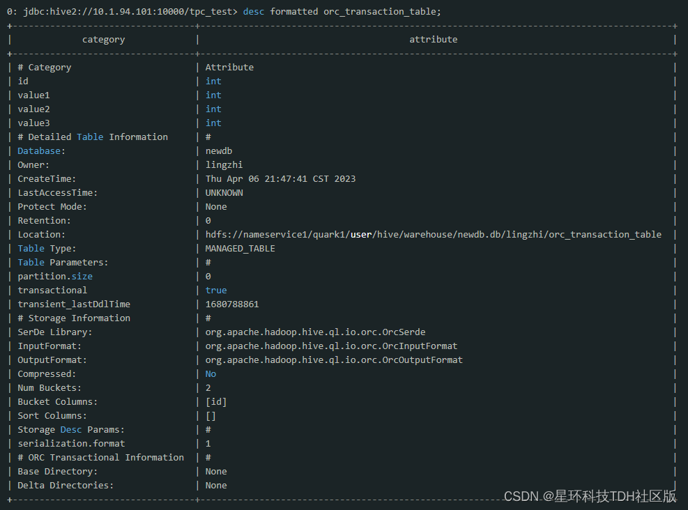 建好表之后用desc formatted orc_transaction_table命令来获取该表在hdfs上的位置