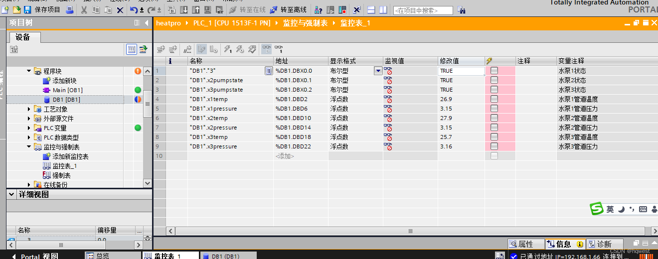 开启水泵1,管道流动了,风扇转动了 ,PLC数据改变了