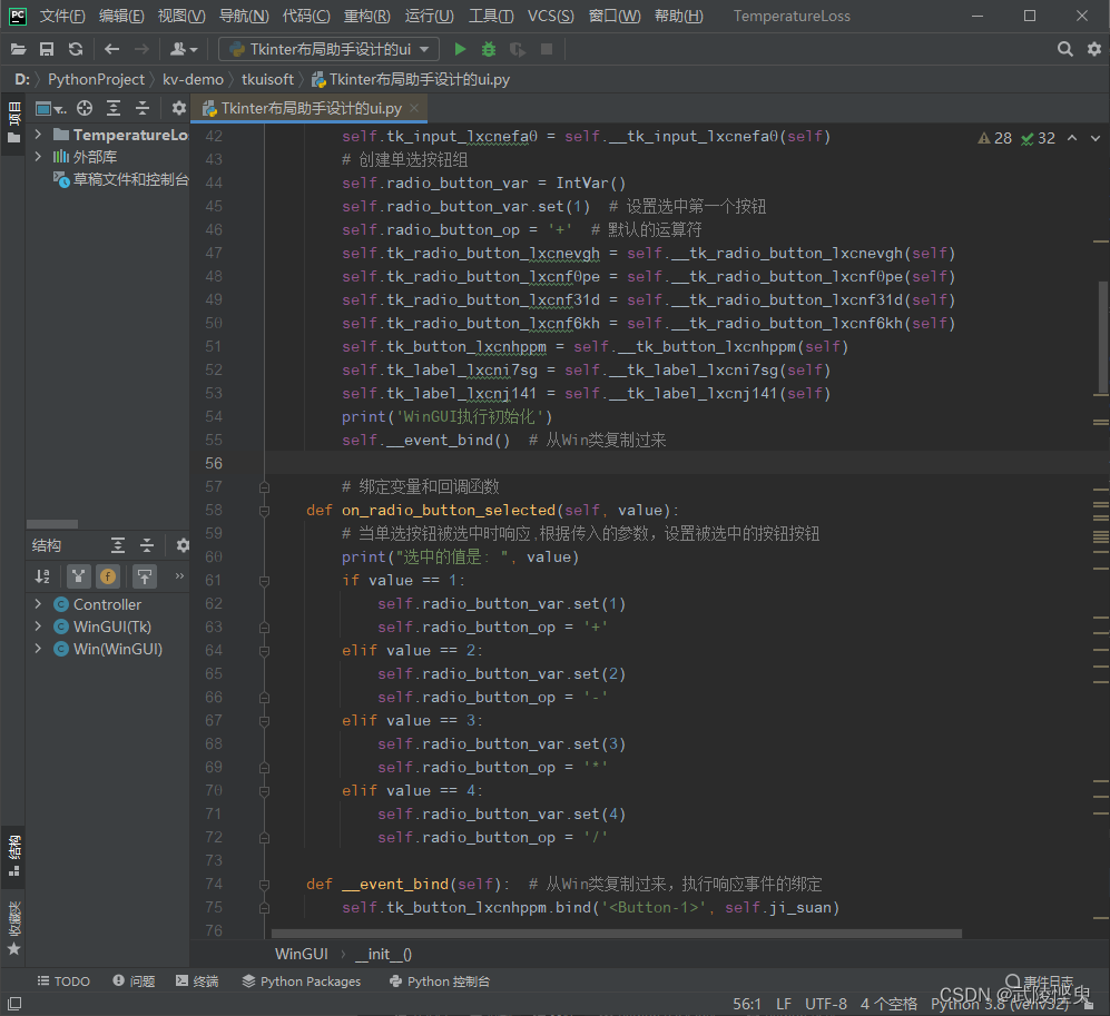 一个问题是我在按钮绑定了响应事件,源码自动添加了一条print语句,点击按钮后应该会打印一条信息。但我将py文件用pycharm打开后直接运行,点按钮没有出现预设的打印信息。我检查了软件发现绑定事件是放在Win类中的,响应事件对应的函数是放在Controller类中的,而软件直接调用的WinGUI类,而WinGUI类并没有调用前面两个类,导致了点按钮无响应,我只好对源码进行修改来实现按钮的响应。