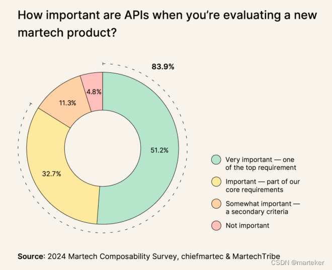 正如本文顶部的图表所示,对于83.9%的Martech买家来说,API已经很重要或非常重要。事实上,对于51.2%的买家来说,API是他们评估新Martech产品时的首要要求之一。