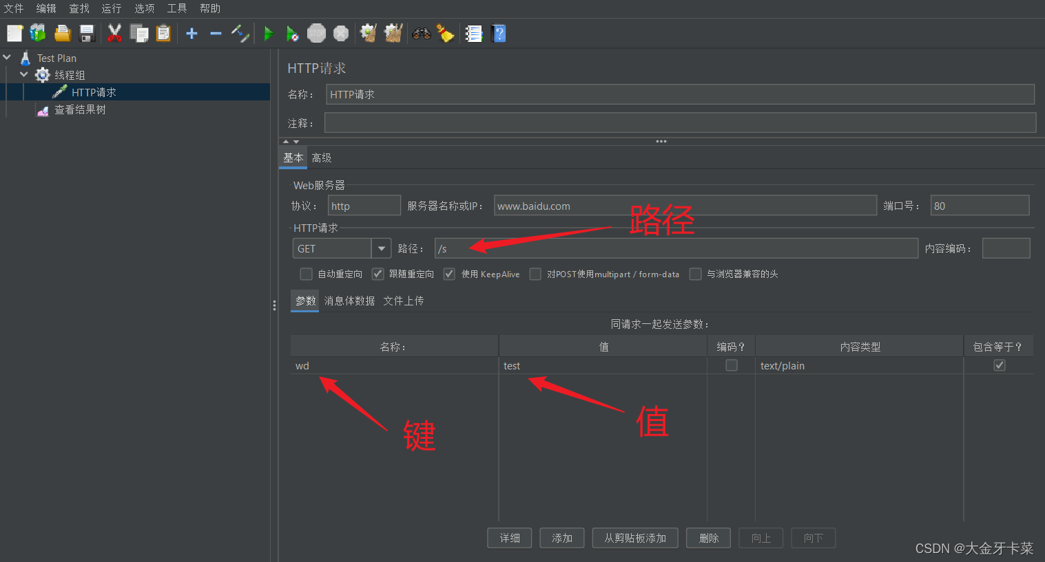 案例三:POST请求,URI为百度安全验证,请求体为:wd=test(form表单要求:使用HTTP请求-参数列表来传递POST请求的form格式参数