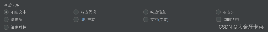 参数配置详细介绍: 测试字段:要检查的项(实际结果) 响应文本:来自服务器的响应文本,即主体响应代码:响应的状态码,例如:200 响应信息:响应的信息,例如:OK Response Headers:顺应头部 Request Headers:请求头部 Request Data:请求数据 URL样本:请求URL Document(text):响应的整个文档忽略状态:忽略返回的响应状态码