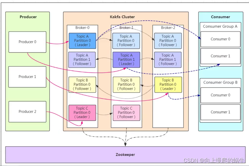 实现高可用,分区leader 分布在不同的kafka 服务器,假设分区因子为 3, 分区 0 的leader为服务器A,则服务器 B 和服务器 C 为 A 的follower,而分区 1 的leader为服务器B,则服务器 A 和C 为服务器B 的follower,而分区 2 的leader 为C,则服务器A 和 B 为C 的follower。