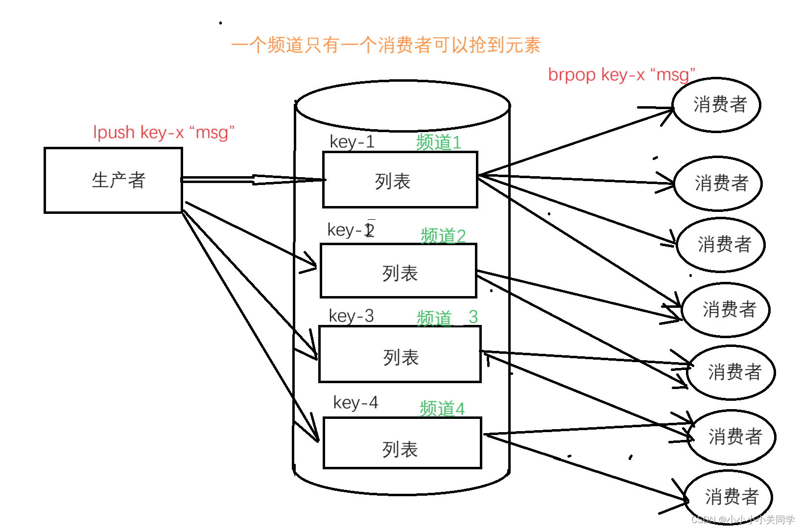 如图所示,Redis 同样使用 lpush+brpop 命令,但通过不同的键模拟频道的概念,不同的消费者可以通过 brpop 不同的键值,实现订阅不同频道的理念。