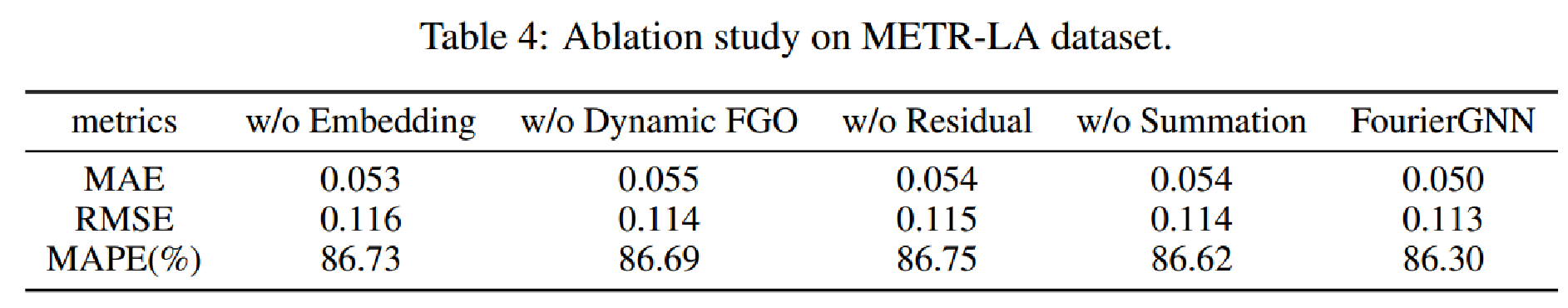 (1) w/o Embedding: FourierGNN的一个变体将原始MTS输入而不是将其嵌入到傅里叶空间的图卷积中