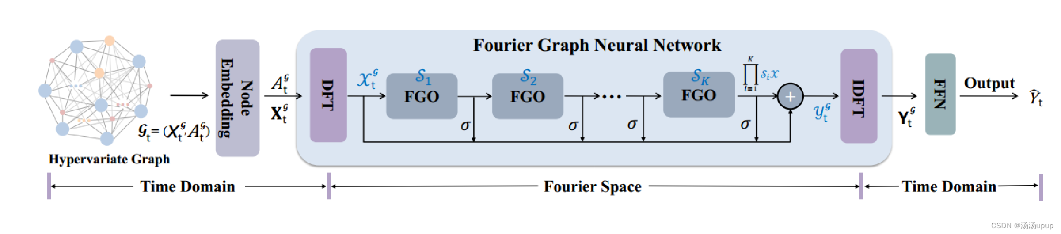 过程:(1)建图:构建全连通变量图 (2)节点嵌入:使用嵌入矩阵为每个节点嵌入d维向量 (3)离散傅里叶变换:将时域转到频域 (4)在傅里叶空间进行一系列递归乘法 (5)进行逆傅里叶变换:转回时域 (6)使用两层前馈网络FNN投影