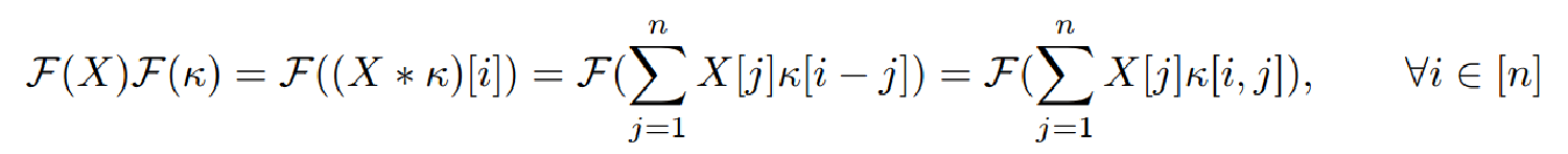 上述式子的原理来源于卷积定理:它表示两个信号卷积的傅里叶变换等于它们的傅里叶变换在频域中的点积