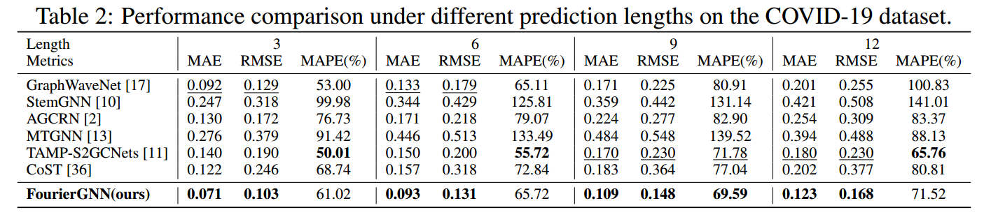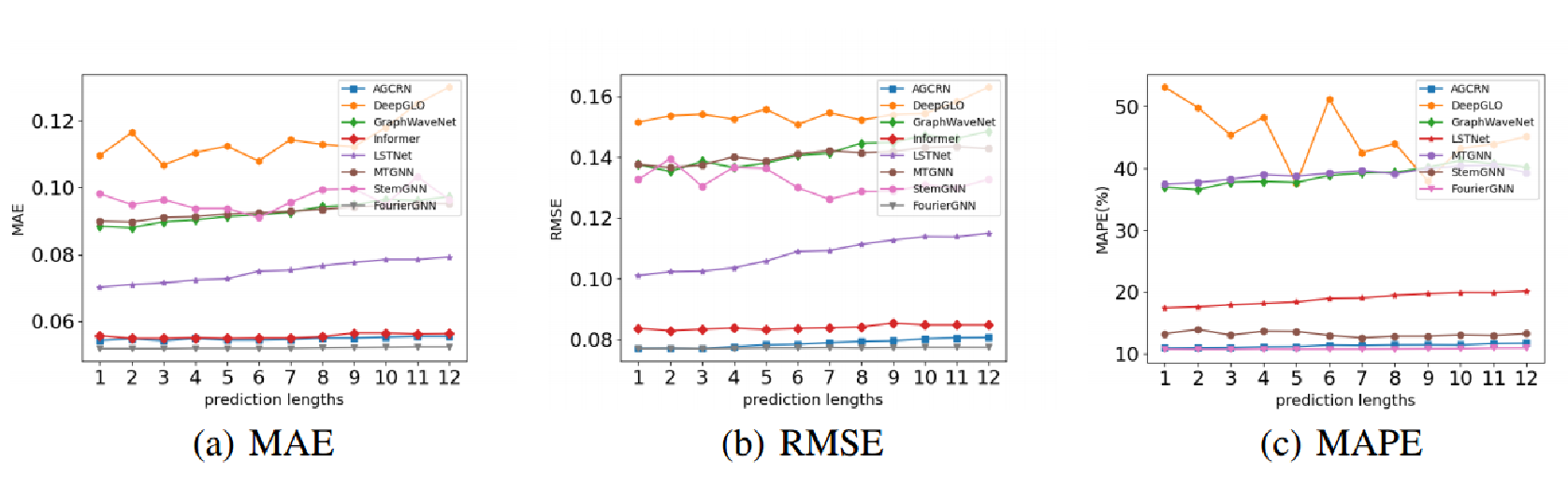 3、FourierGNN以更高的效率和更少的参数实现了最先进的性能,并且超变量图结构表现出强大的编码时空相互依赖关系的能力