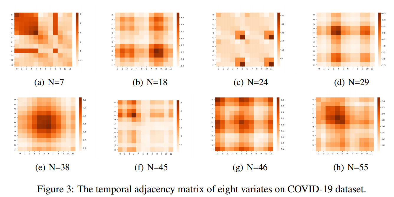 将不同变量的时间邻接矩阵可视化 从COVID-19数据集中随机选择8个县,计算每个县连续12个时间步长的关系,可视化邻接矩阵 结果表明,FourierGNN在每个县学习到不同的时间模式,这表明该超变量图可以编码丰富的、有区别的时间依赖性。