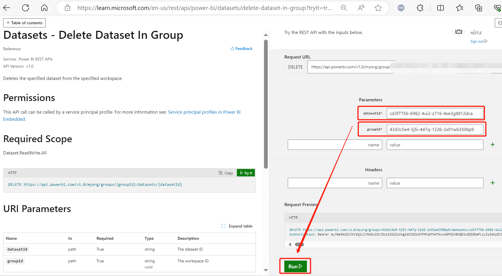 6,登录你的Power BI账号密码,将工作区 ID 粘贴到“groupId”文本框中,然后再将语义模型 ID 粘贴到“datasetId”文本框,最后点击“运行”。