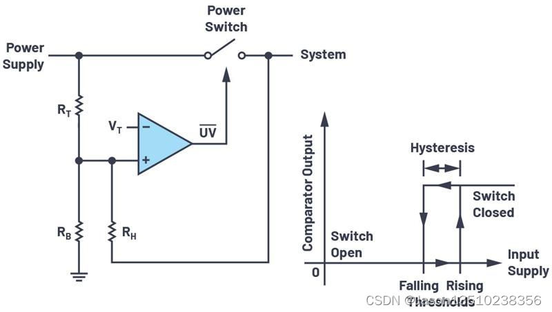 图 1 显示了一个欠压锁定电路(目前没有滞后)。它有一个比较器,其负输入端带有正参考电压 (V T )。比较器控制电源开关,打开或关闭电源输入和下游电子系统之间的路径。比较器的正输入从输入连接到一个电阻分压器。如果电源打开并从 0 V 开始上升,则比较器输出初为低电平,使电源开关保持关闭状态。当比较器的正输入达到 V T时,比较器输出跳闸。此时底部电阻中的电流为V T /R B。R T中流过相同的电流如果比较器没有输入偏置电流。因此,比较器触发时的电源电压为 V T + R T × V T /R B = V T × (R B + R T )/R B。这是由电阻分压器设置的电源 UVLO 阈值。例如,1 V 的 V T和 R T = 10 × R B产生 11 V 的 UVLO 阈值。低于此阈值,比较器输出为低电平,打开电源开关;高于此 UVLO 阈值时,开关闭合,电源流过以启动系统。通过改变 R B和 R的比例可以很容易地调整阈值吨。电阻值由为分压器预算的偏置电流量设置(稍后会详细介绍)。要设置 OVLO 阈值,只需交换比较器的两个输入(例如,参见图 2 中下方的比较器),这样一个高电平输入会强制比较器输出为低电平并打开开关。