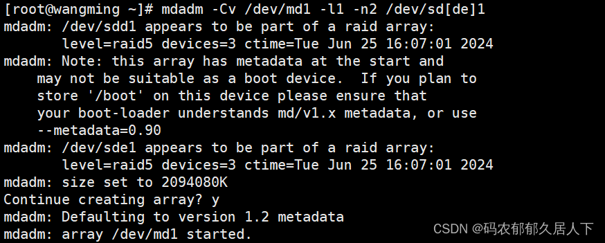 mdadm -Cv /dev/md0 -l1 -n2 /dev/sd[de]1 ##创建RADI 1