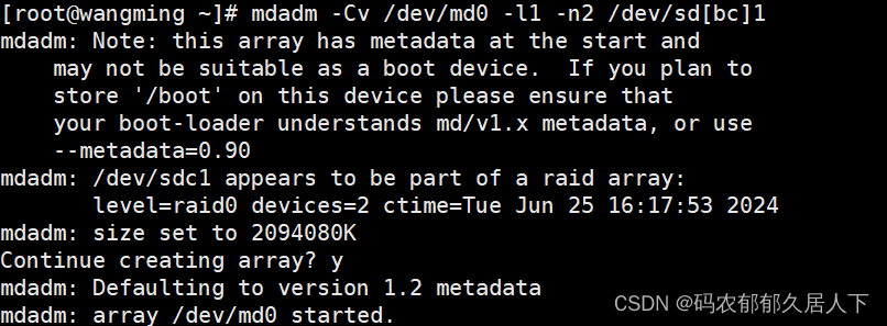 mdadm -Cv /dev/md10 -l0 -n2 /dev/md0 /dev/md1 ##将RAID 0和1组合创建RAID 10