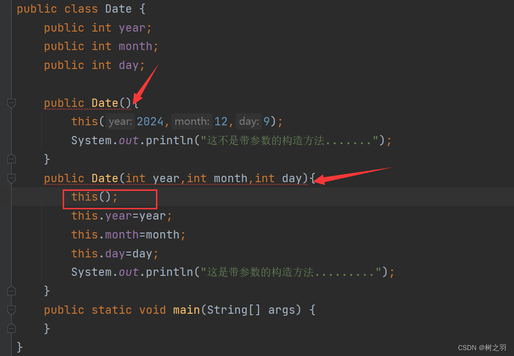 以上代码定义了一个日期类,然后main方法中创建了三个对象,并通过Date类中的成员方法对对象进行设置和打 印,代码整体逻辑非常简单,没有任何问题。 但是我们能明显的注意到的是如图: