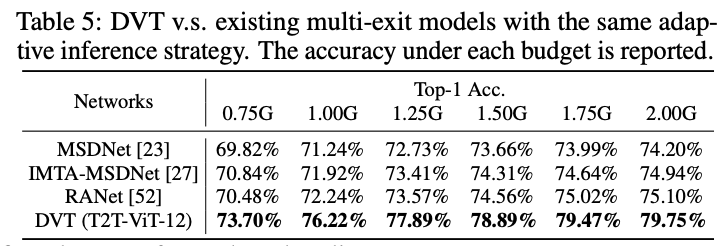 DVT是一个通用框架,可集成到大多数图像识别的Transformer模型中。而且可以通过简单地调整提前终止标准,在线调整整体计算成本,适用于计算资源动态波动或需要以最小功耗来实现特定性能的情况。从ImageNet和CIFAR的实验结果来看,在精度相同的情况下,DVT能将T2T-ViT的计算成本降低1.6-3.6倍,而在NVIDIA 2080Ti上的真实推理速度也与理论结果一致。