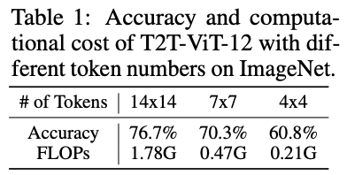 论文认为不同图片之间存在相当大的差异,使用相同数量的token处理所有图片并不是最优的。最理想的做法应为每个输入专门配置token数量,这也是模型计算效率的关键。以T2T-ViT-12为例,官方推荐的14x14 token数仅比4x4 token数增加了15.9%(76.7% 对 60.8%)的准确率,却增加了8.5倍的计算成本(1.78G 对 0.21G)。也就是说,对“简单”图片使用14x14 token数配置浪费了大量计算资源,使用4x4 token数配置就足够了。