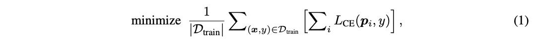 其中,(x,y)" role="presentation">(x,y)为训练集Dtrain" role="presentation">Dtrain中的一个样本及其对应的标签,采用标准的交叉熵损失函数LCE(·)" role="presentation">LCE(⋅),而pi" role="presentation">pi表示第i" role="presentation">i个模型输出的softmax预测概率。
