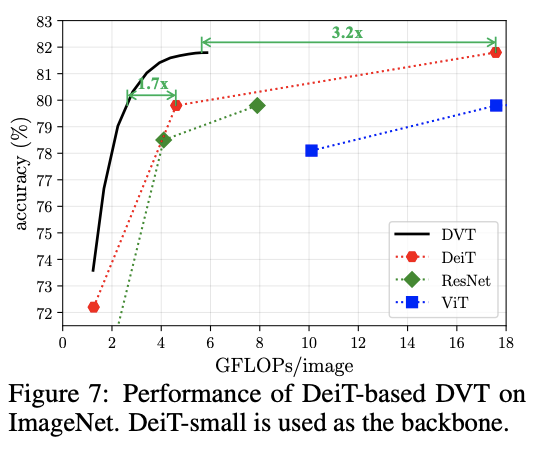如前面所述,DVT框架逐渐增加测试样本的token数量并执行提前终止,“简单”和“困难”图像可以使用不同的token数来处理,从而提高了整体效率。对于第i" role="presentation">i个模型产生的softmax预测pi" role="presentation">pi,将pi" role="presentation">pi的最大项maxjpij" role="presentation">maxjpij与阈值μi" role="presentation">μi进行比较。如果maxjpij≥μi" role="presentation">maxjpij≥μi,则停止并采用pi" role="presentation">pi作为输出。否则,将使用更多token数更多的下游模型继续预测直到最后一个模型。