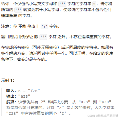 public String modifyString(String s) { char[] ch = s.toCharArray(); int n = s.length(); for(int i = 0; i < n; i++){ if(ch[i] == '?'){ //替换 for(char j = 'a'; j <= 'z'; j++){ //如果 i == 0 的话,就需要判断它前一个数相等不相等 //如果 i == n-1 的话,就需要判断它前一个数相不相等 if(((i == 0) || (ch[i-1] != j)) && ((i == n-1) || (ch[i+1] != j))){ ch[i] = j; break; } } } } return String.valueOf(ch); }