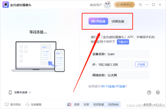 步骤1、运行电脑端的金舟虚拟摄像头,可以看到软件支持两种连接方式;