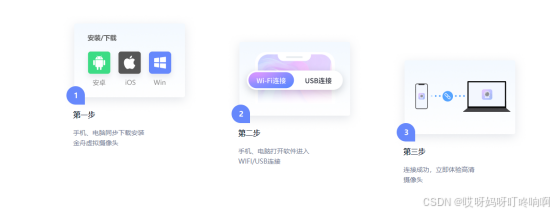 金舟虚拟摄像头特点:高清画质、便捷操作、支持多种连接方式(WIFI无线连接、IP连接和USB连接)。可以将手机摄像头和麦克风与电脑连接,实现手机秒变电脑摄像头和麦克风的功能。同时支持手机息屏使用,降低耗电量