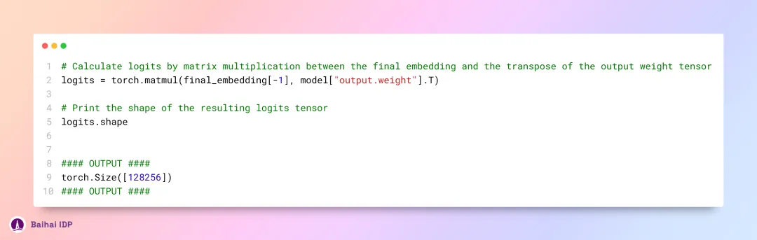 现在,我们已经得到了最终的嵌入表征,这是模型预测下一个词元(token)的依据。这一嵌入的结构与普通的词元嵌入(token embeddings)一致,为 [17x4096] ,意味着由 17 个 token 构成,每个 token 的嵌入向量维度为 4096 。