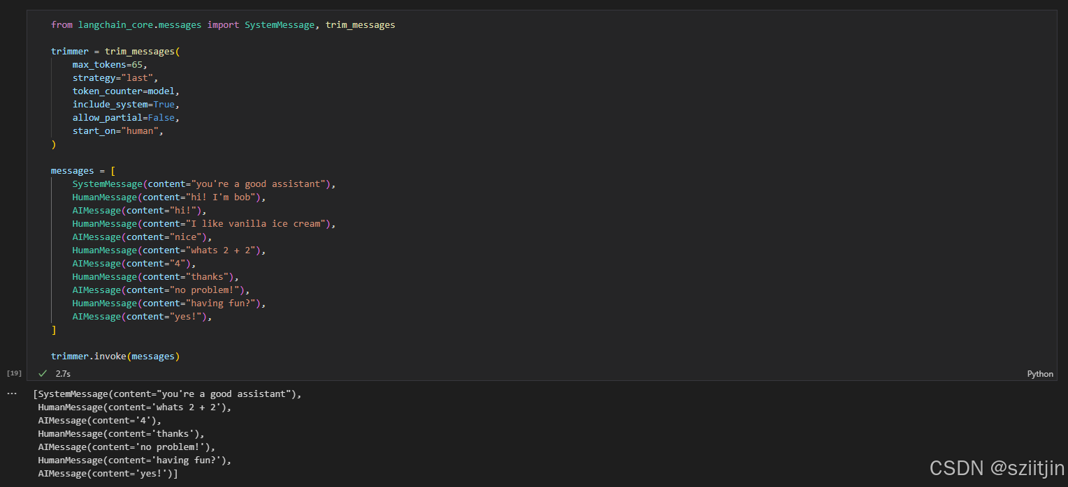 1)LangChain带有一些内置的帮助程序,用于管理消息列表。在本例中,我们将使用 trim_messages 帮助程序来减少发送到模型的消息数。trimmer 允许我们指定要保留的token数量,以及其他参数,例如我们是否要始终保留系统消息以及是否允许部分消息: