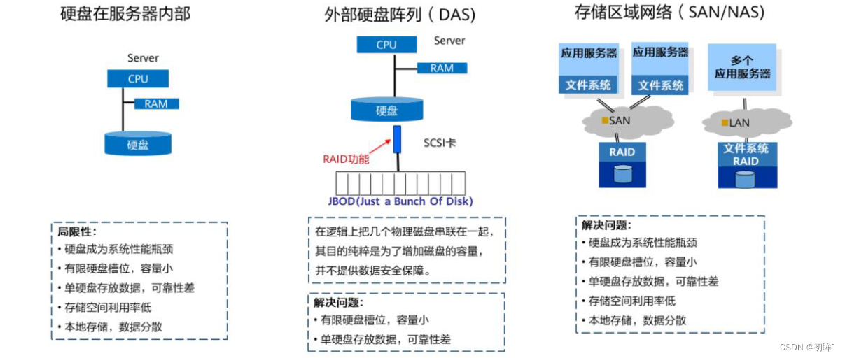 - 最初的服务器是计算存储合一的,使用服务器本地存储存放数据,这就是块存储的始祖,通过服务器内部总线连接磁盘,可以达到很低的时延,但是服务器可以承载的磁盘数量有限,在容量、带宽以及可靠性上有所欠缺。随着IT的发展,数据越来越多,对数据可靠性的要求越来越高,就有了计算、存储分离的需求,这时就有了存储阵列。传统的磁盘阵列采用控制器+磁盘框的架构,控制器采用双机头或者多机头设计,可靠性更高,通过扩展磁盘框,存储容量相比服务器本地磁盘,有了成百上干倍的提高独立地通过FC交换机或者IP交换机与服务器相连,这就是现代的块存储。