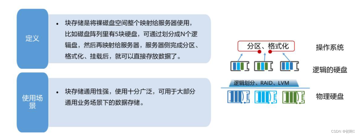 - 块存储是无法直接在操作系统中使用的,必须对块存储进行格式化、创建文件系统后才能使用,操作系统中的数据都是按照文件的格式存放的。