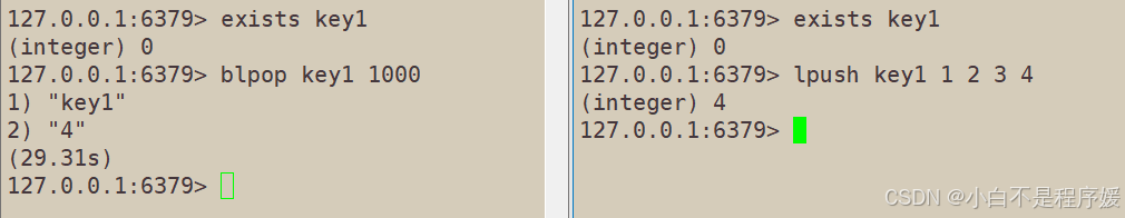 - 在列表中有元素的情况下,阻塞和⾮阻塞表现是⼀致的。但如果列表中没有元素,⾮阻塞版本会理解返回 nil,但阻塞版本会根据 timeout,阻塞⼀段时间,期间 Redis 可以执⾏其他命令,但要求执⾏该命令的客⼾端会表现为阻塞状态。