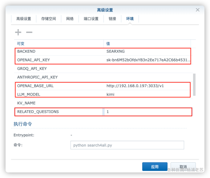 OPENAI_API_KEY:One API 中的令牌;OPENAI_BASE_URL:One API 的局域网地址;LLM_MODEL:选择了 kimi;RELATED_QUESTIONS:选择了 1,用于显示相关问题;BACKEND:选择了基于本地部署的 SEARXNG;SEARXNG_BASE_URL:填入 SEARXNG 的地址;这些参数基本上都已经有了,需要下来一个一个找到并填写值
