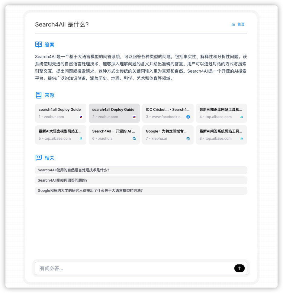 Search4All是个人AI搜索协助工具,是Perplexity的开源替代品。能让你的LLM API支持联网,搜索、新闻、网页总结,