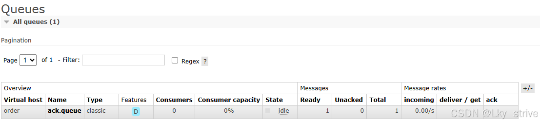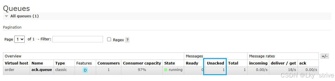 从 RabbitMQ 的 web 管理平台上,也可以看到当前队列中 Ready 和 Unacked 状态的消息数
