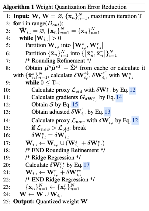 在实践中,通过使用 1N∑NnˉxrnˉxsTn 和 1N∑NnˉxrnˉxrTn 来估计 E[ˉxrˉxsT] 和 E[ˉxrˉxrT] 。随后, Wri,:=Wri,:+δWr∗i,: 以减小误差。目前, Wri,: 仍然保持为全精度,并将在下一次迭代中处理。该过程持续进行,直到所有权重被准确量化。所提出的Rounding Refinement和Ridge Regression共同形成了Wqer,其整体过程在算法1中给出。在实践中,对多个输出通道并行执行Wqer。