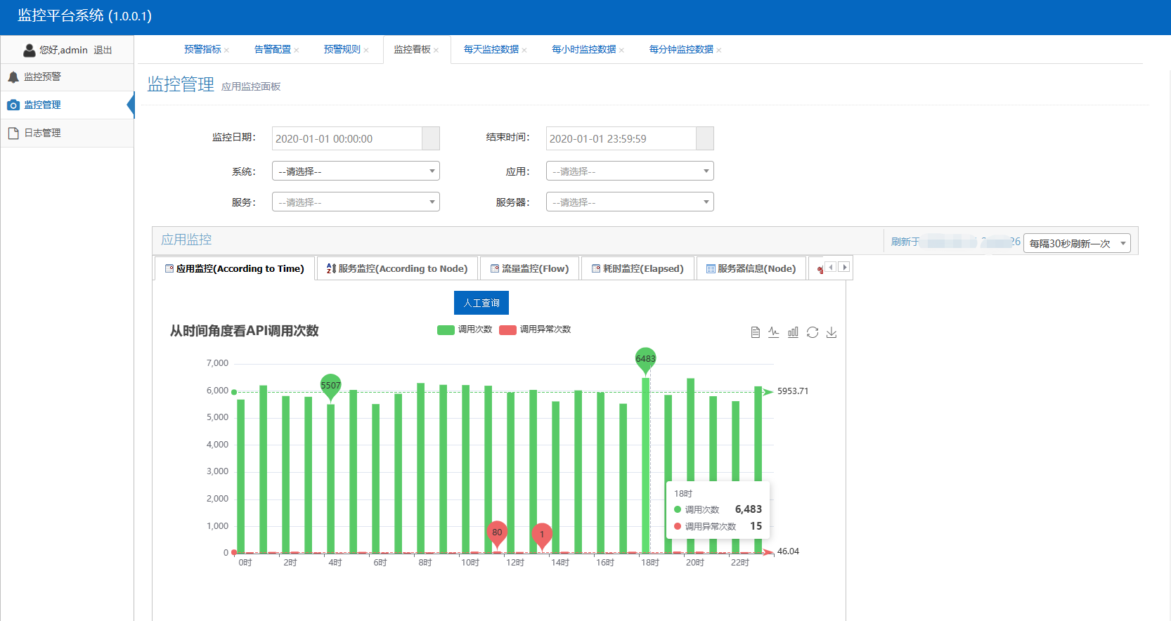 Power.XMonitor开发了几个常用的业务监控仪表盘,支持将常见监控指标通过柱状图、饼图和折线图进行友好展示,可在页面灵活配置刷新时间自动刷新获取数据。