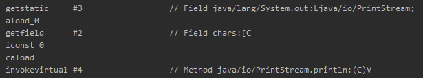 getstatic:获取指定类的静态域, 并将其压入栈顶 aload_0:将第一个引用类型本地变量推送至栈顶 getfield:获取指定类的实例域, 并将其值压入栈顶 iconst_0:将int型0推送至栈顶 caload:将char型数组指定索引的值推送至栈顶 invokevirtual:调用实例方法