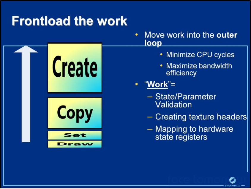 对于异步资源,使用Device的接口创建资源,所有接口都是线程无关的,使用良好的粒度同步图元。资源的上传和着色器编译可以同时发生。对状态和绘制提交,存在两个优先级,高优先级的是多线程的提交,专用的显示列表(display list),低优先级的是逐物体的显示列表,可多次重复使用。此外,DX11的显示列表是不可更改的。