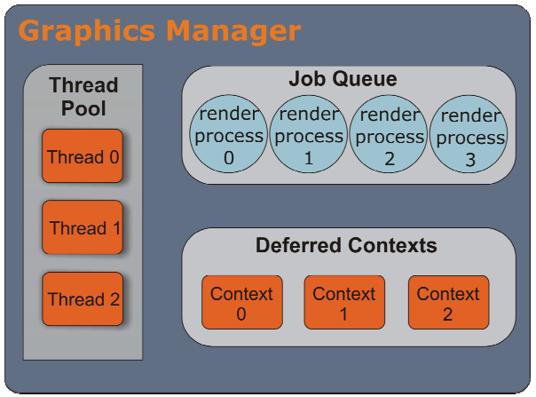 D3D设备的功能拆分成3个:设备(Device)、立即上下文(Immediate Context)、延迟上下文(Deferred Context)。设备有空闲的线程资源创建,即时上下文是状态、绘制和查询的单一主设备,延迟上下文是状态和绘制的逐线程设备。
