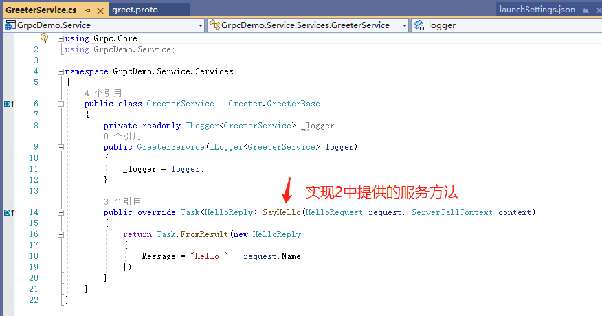 3.服务类,Greeter.GreeterBase来自于2中的proto文件自动生成的类,生成的类在\obj\Debug\net6.0\Protos 目录下。