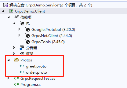 <Protobuf Include="Protos\greet.proto" GrpcServices="Client" /> <Protobuf Include="Protos\order.proto" GrpcServices="Client" />