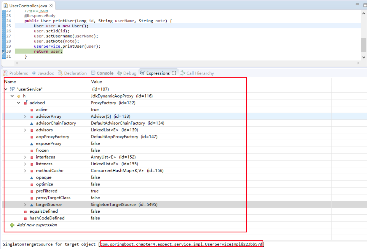 package com.springboot.chapter4.aspect.controller; /**** imports ****/ // 定义控制器 @Controller // 定义类请求路径 @RequestMapping("/user") public class UserController { // 注入用户服务 @Autowired private UserService userService = null; // 定义请求 @RequestMapping("/print") // 转换为JSON @ResponseBody public User printUser(Long id, String userName, String note) { User user = new User(); user.setId(id); user.setUsername(userName); user.setNote(note); userService.printUser(user);// 若user=null,则执行afterthrowing方法 //测试引入 UserValidator userValidator = (UserValidator)userService; if (userValidator.validate(user)) { userService.printUser(user); } return user;// 加入断点 } }