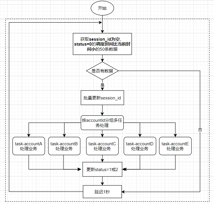 首先要无相关,即按AccountId分组,分组内的数据是无冲突/相关的,可以分批进行。记录各任务状态,最后统一提交数据库状态,然后1s后继续轮询。这种类似静态流水线。动态流水线较为复杂,这里暂不做实现。