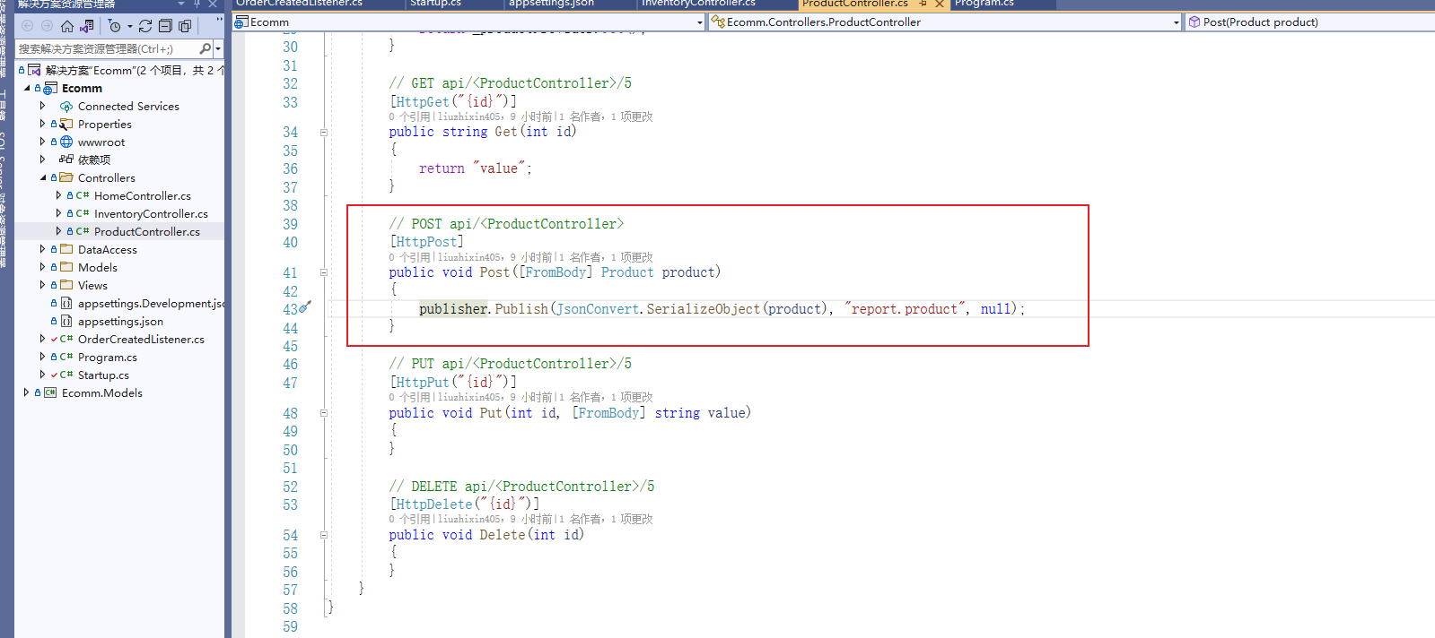 1 2 3 4 5 6 7 8 9 10 11 12 | [HttpPost]public async Task Post([FromBody] OrderDetail orderDetail){ var id = await orderCreator.Create(orderDetail); publisher.Publish(JsonConvert.SerializeObject(new OrderRequest { OrderId = id, ProductId = orderDetail.ProductId, Quantity = orderDetail.Quantity }), "order.created", null);} |