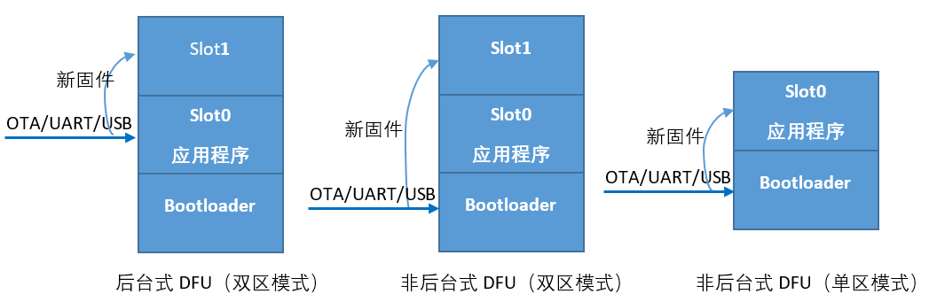 不管采用OTA方式还是有线通信方式,DFU包括后台式(background)和非后台式两种模式。后台式DFU,又称静默式DFU(Silent DFU),在升级的时候,新固件在后台悄悄下载,即新固件下载属于应用程序功能的一部分,在新固件下载过程中,应用可以正常使用,也就是说整个下载过程对用户来说是无感的,下载完成后,系统再跳到BootLoader程序,由BootLoader完成新老固件拷贝操作,至此整个升级过程结束。比如智能手机升级Android或者iOS系统都是采用后台式DFU方式,新系统下载过程中,手机可以正常使用哦。非后台式DFU,在升级的时候,系统需要先从应用程序跳到BootLoader程序,由BootLoader进行新固件下载工作,下载完成后BootLoader继续完成新老固件拷贝操作,至此升级结束。早先的功能机就是采用非后台式 DFU来升级操作系统的,即用户需要先长按某些按键进入bootloader模式,然后再进行升级,整个升级过程中手机正常功能都无法使用。