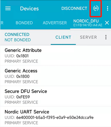 7) 用手机nRF Connect连接设备,成功后,点击右上角的“DFU”图标,选择前面的“ble_intFlash.zip”文件