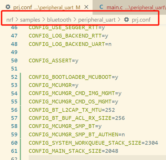 我们把上述config加在nrf\samples\bluetooth\peripheral_uart\prj.conf文件最后,这样prj.conf就改完了。