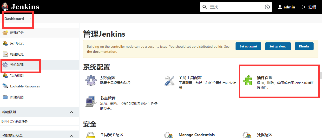上面命令的含义就不解释了啊。都懂的。然后再构建一次,就成功了。我就不贴图了。自己看吧。下面我们给任务加一个node环境。点击Dashboard,然后系统管理,然后点击插件管理: