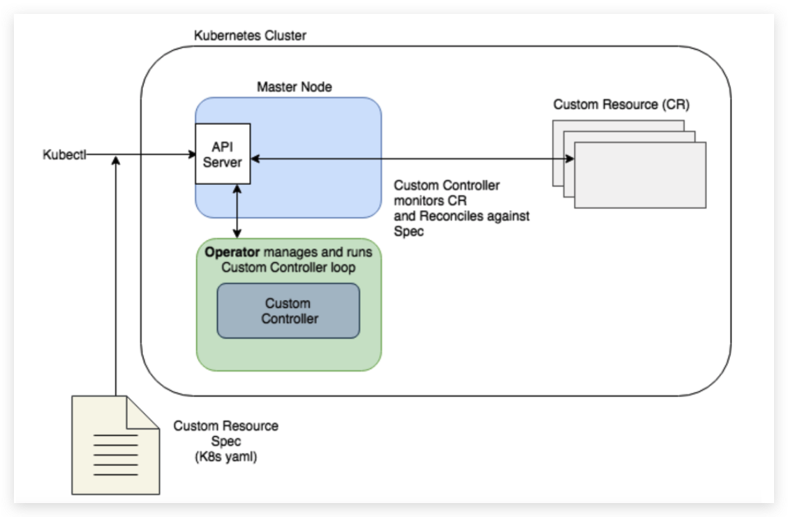 Operator 运行自定义控制器以协调spec。虽然API server能感知到自定义控制器,但是Operator是独立运行的,可以在集群内部或外部运行。