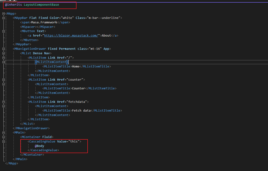 _Layout.cshtml是Blazor应用的主机页(相当于一个根页面布局文件),里面包含应用的初始化HTML 及其组件,它使得我们所有页面布局保持的外观变得更加的容易。