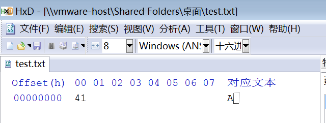 而学校里的课程告诉我们,计算机中存储的都是0和1这种2进制数据,无法存储“A”,那磁盘存储的究竟是什么?我们换另外一类工具来打开这个文本文档,这类工具叫做16进制编辑器,这里使用HxD编辑器。显示如下内容。